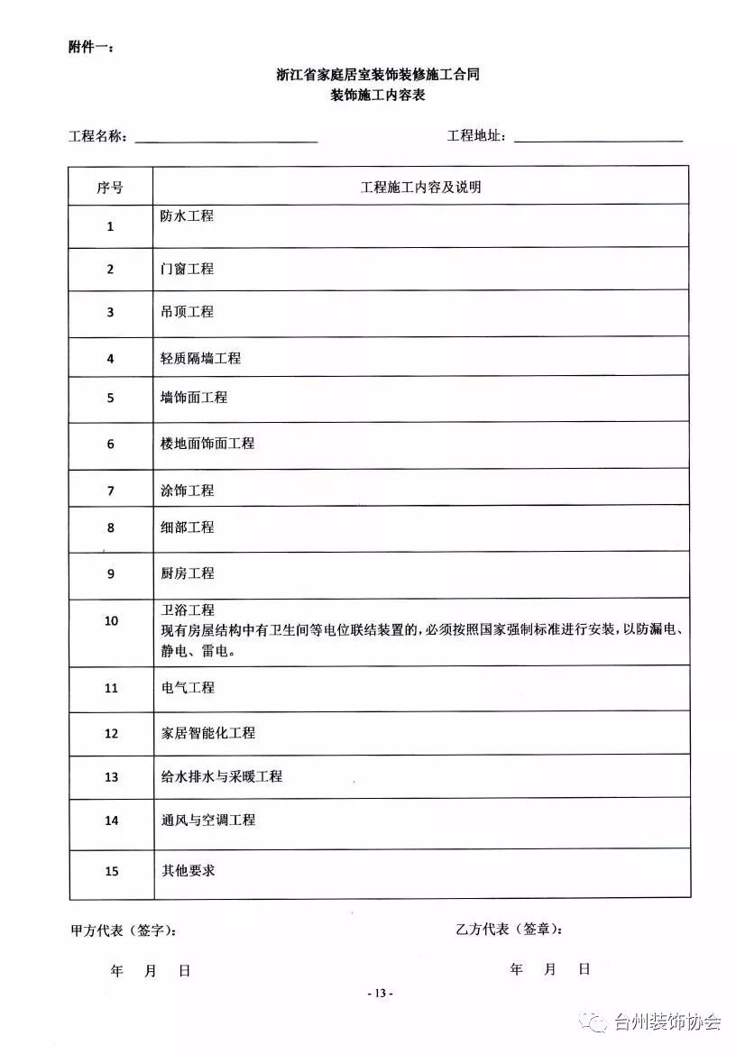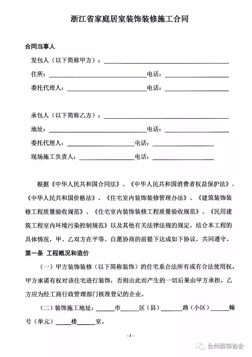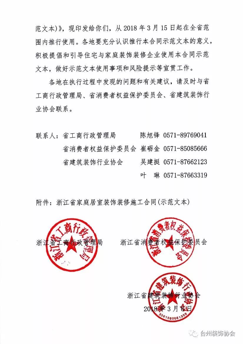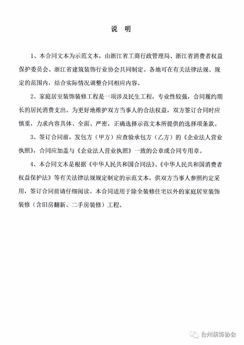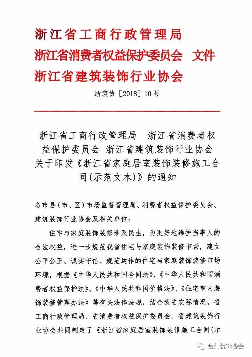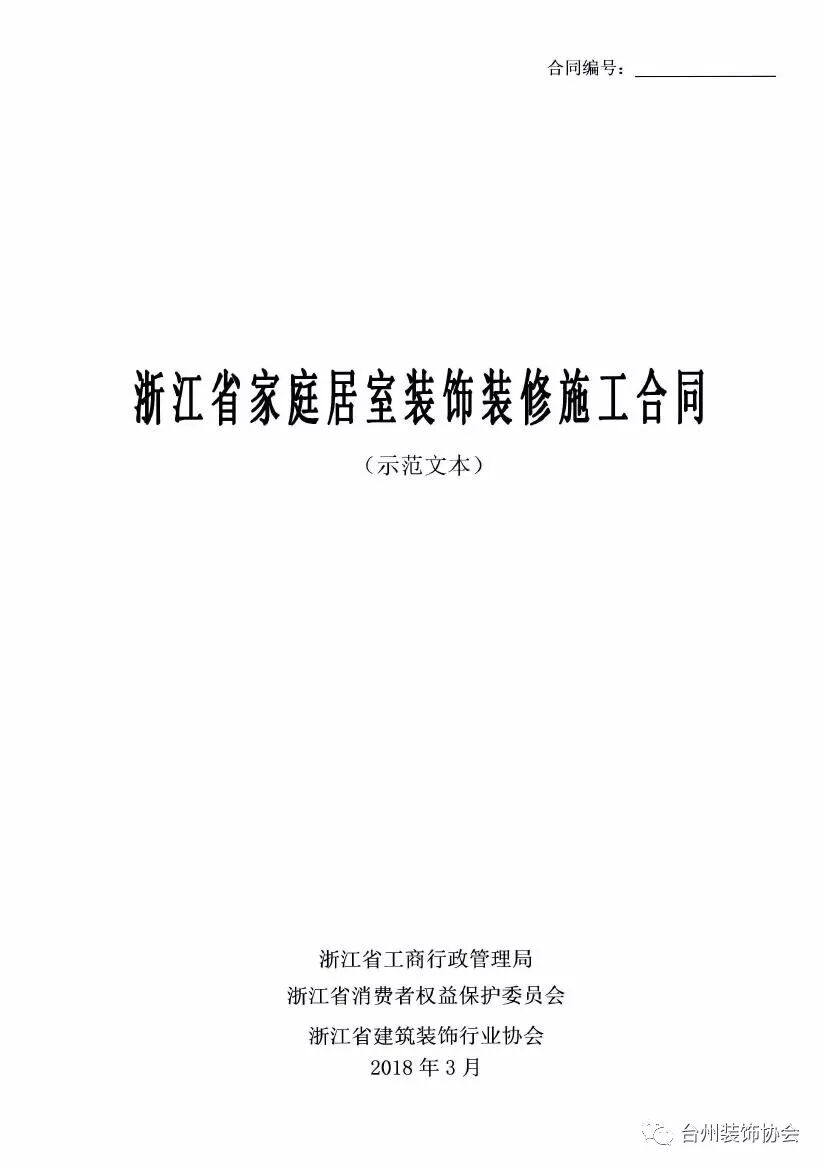 导语:由台州市装饰建材行业协会于今年4月24号率先转发了《浙江省家庭居室装饰装修施工合同(示范文本)》,本公众号再推送一遍。根据(浙装协【2018】10号)文件精神,自2018年3月15日起,在全市范围内推行本合同示范文本。各地提前做好做好相关示范文本使用事项和风险提示等宣贯工作,在执行过程中发现的问题和有关建议,请及时与省工商局和市局联系。台州市装饰建材行业协会为浙江省建筑装饰行业协会团体成员单位(台州市装饰建材行业协会简称:台装协)