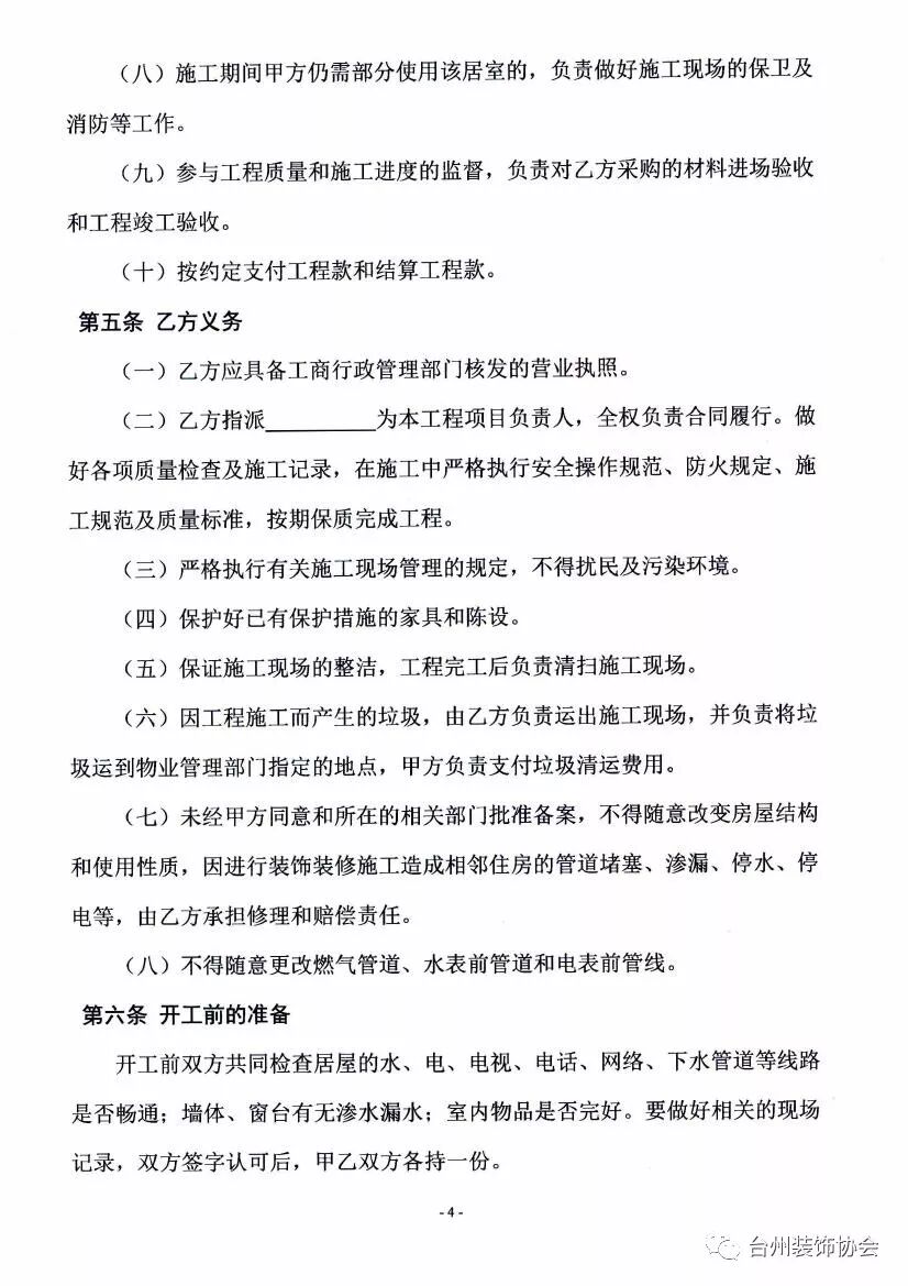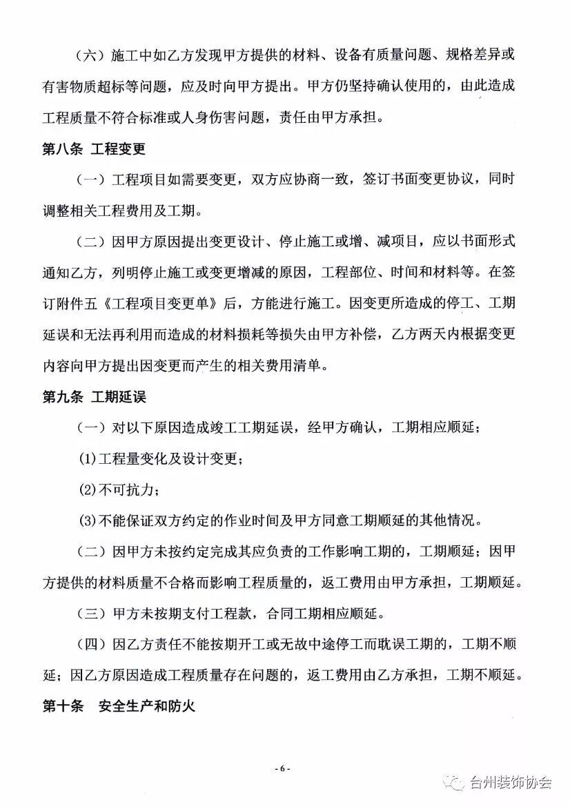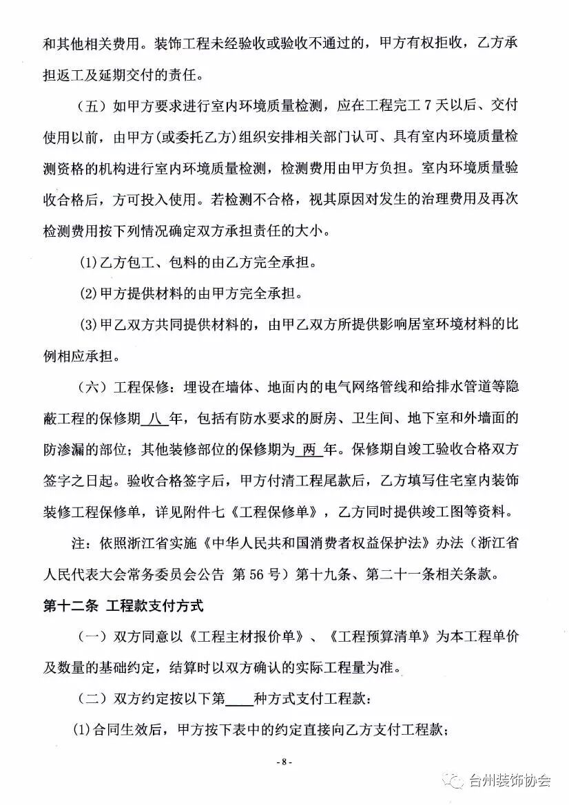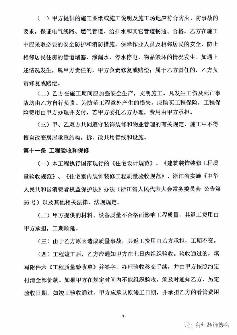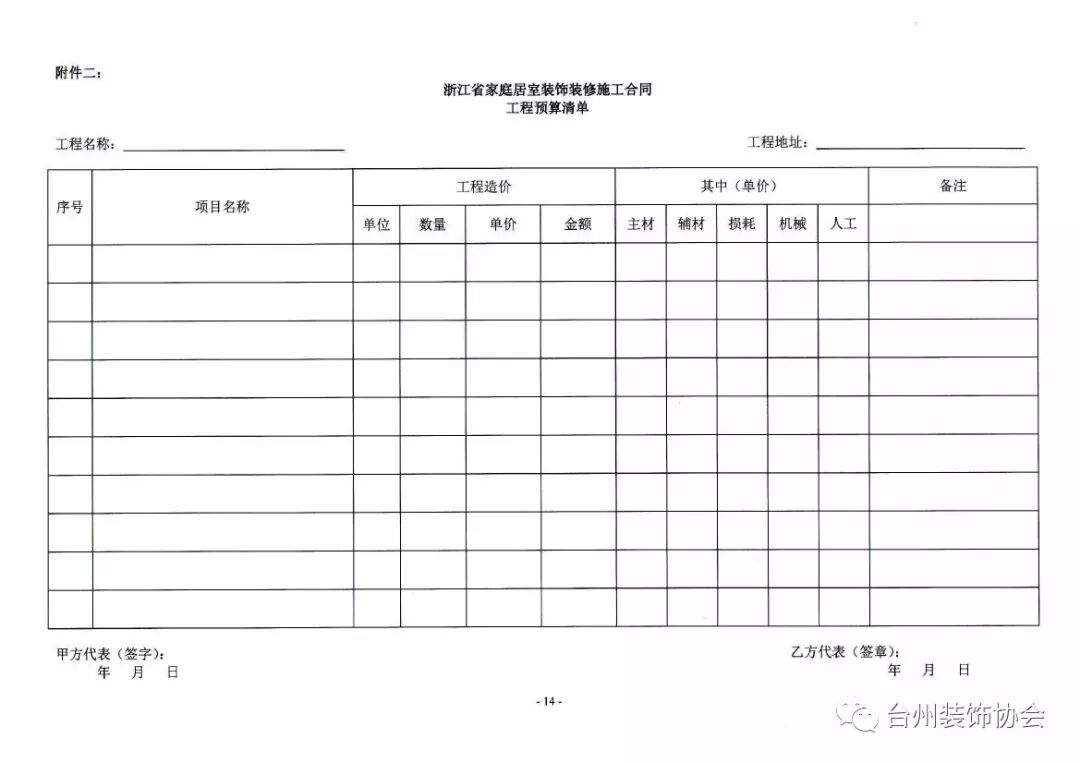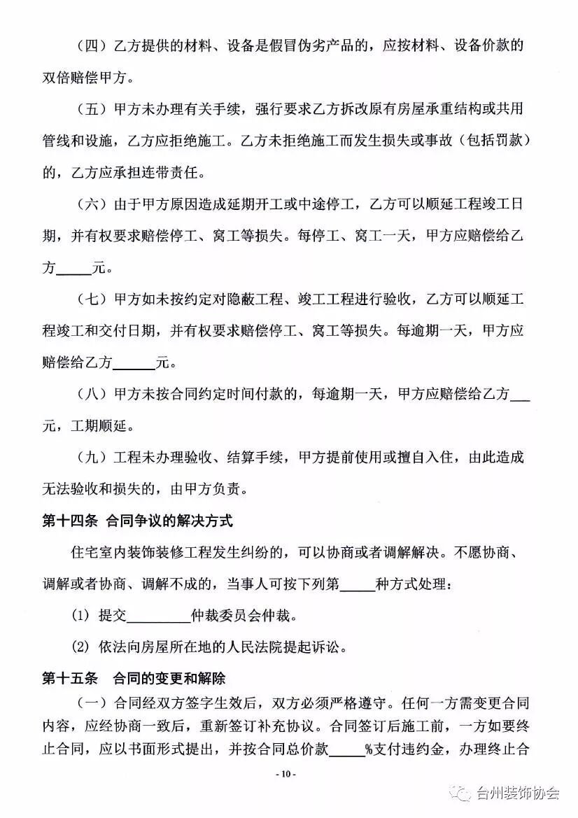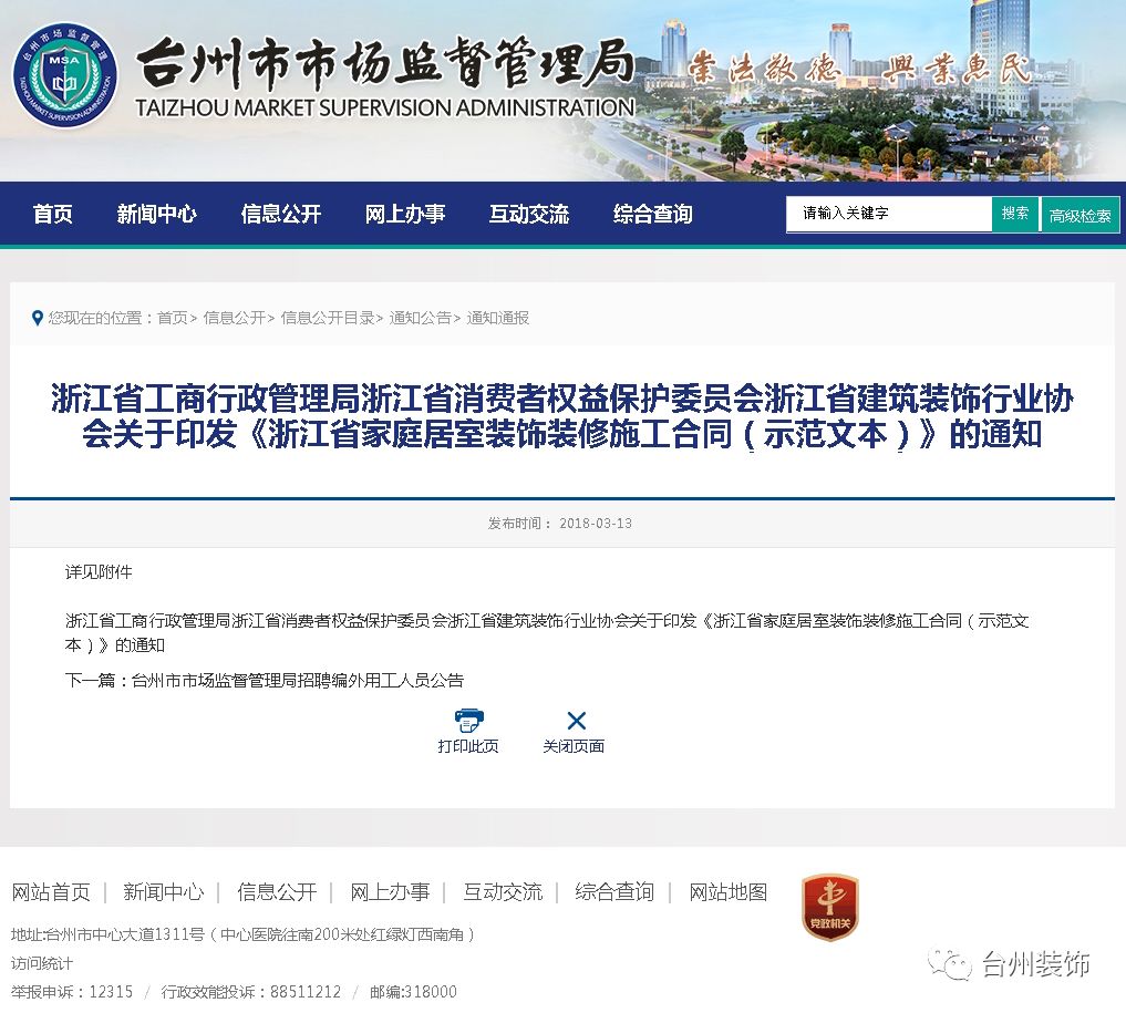 导语:由台州市装饰建材行业协会于今年4月24号率先转发了《浙江省家庭居室装饰装修施工合同(示范文本)》,本公众号再推送一遍。根据(浙装协【2018】10号)文件精神,自2018年3月15日起,在全市范围内推行本合同示范文本。各地提前做好做好相关示范文本使用事项和风险提示等宣贯工作,在执行过程中发现的问题和有关建议,请及时与省工商局和市局联系。台州市装饰建材行业协会为浙江省建筑装饰行业协会团体成员单位(台州市装饰建材行业协会简称:台装协)