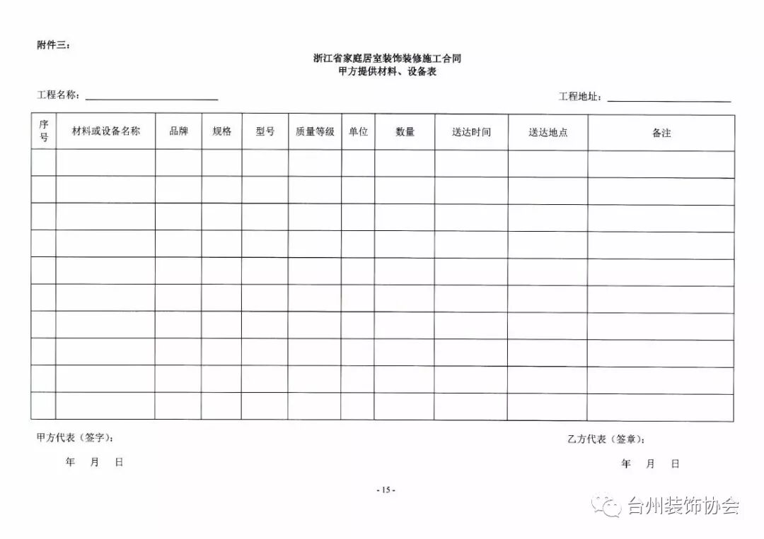 这8个附件是约束“不良装修公司”的利器,例如在甲方提供材料、设备表中,明确规定需要约定材料或设备名称、品牌,规格型号,质量等级,单位,数量,送达时间,送达地点以及备注,让装修公司所有的材料设备都透明化、公开化,使得流程上无漏洞可钻。