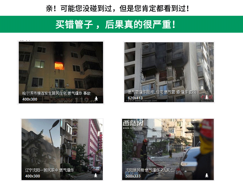 上海、福州、德阳三个地区,燃气公司给配的燃气阀门比较特殊,是属于非标4分,俗称3分(实际也不是标准3分),燃气阀外直径为18mm左右,淘宝上卖的燃气管螺口一般都是标准4分规格(直径20mm),如果不注意尺寸买回去可能无法使用。这3个地区的客户,购买前请量一量您家里燃气阀的外丝接口尺寸,若是20mm就选择我们的4分螺口,若是18mm请不要购买。